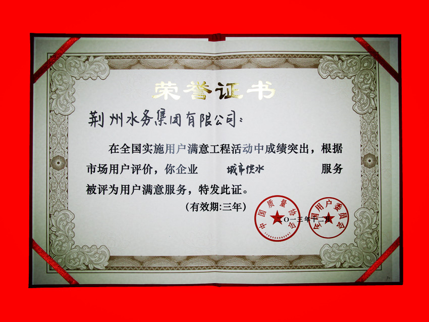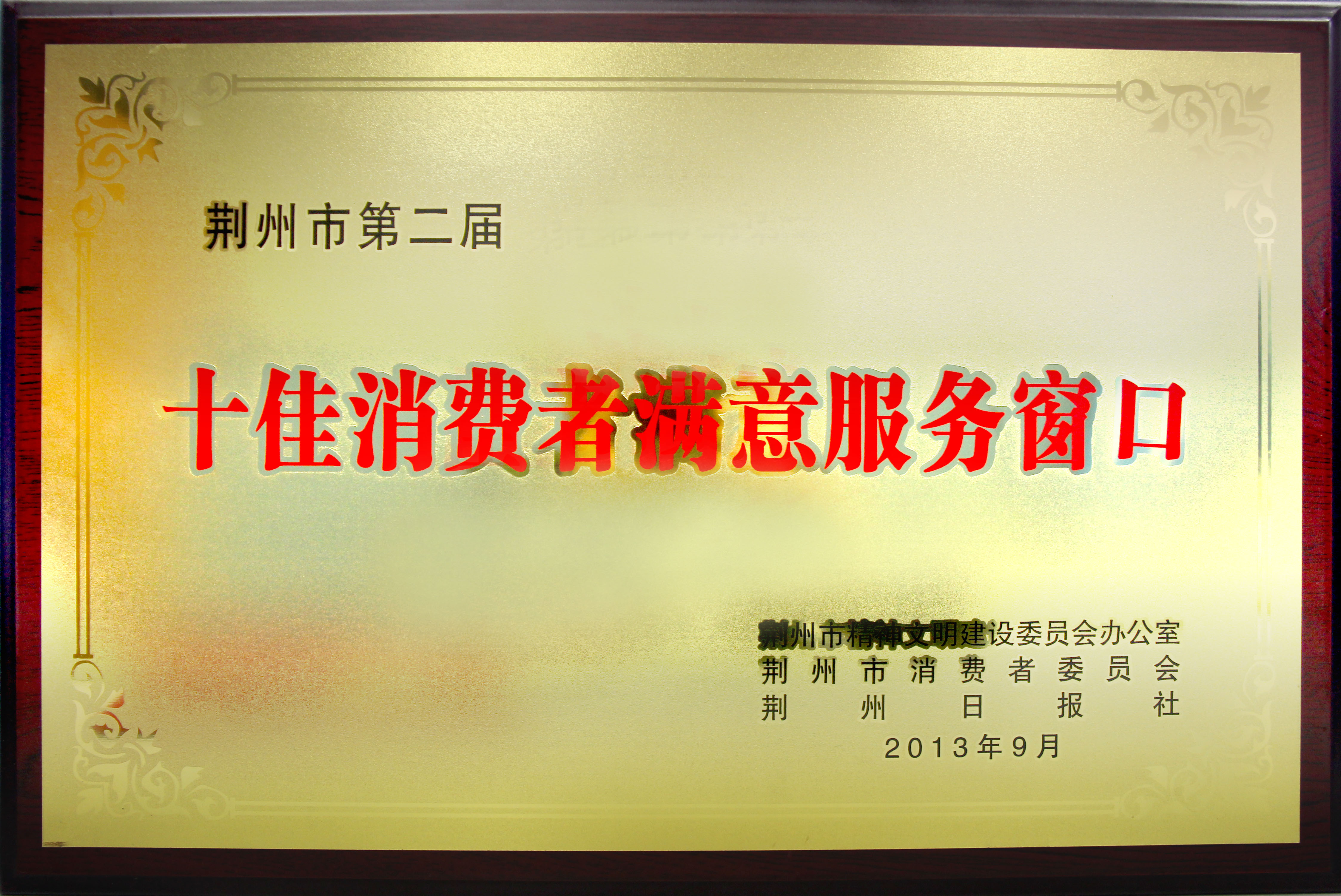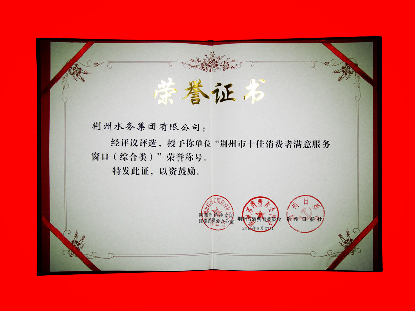 荆州市十佳消费者满意服务窗口 证书