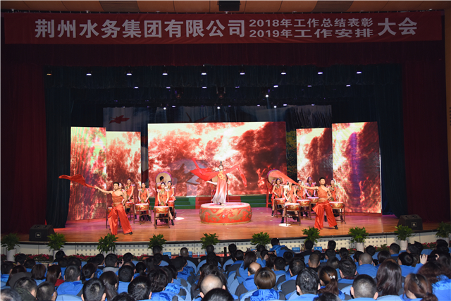 上午9:00,隨著一陣清脆鈴聲的響起,荊州水務(wù)集團有限公司2019年年會暨頒獎典禮正式拉開序幕。伴隨著大屏幕上一幅幅照片、一段段視頻的徐徐播放,大家仿佛又被帶回那剛剛逝去的2018,心中滿是辛勤耕耘后的欣慰和自豪。一支喧天的舞蹈《戰(zhàn)鼓催春》更仿佛熊熊燃燒的火焰,瞬間點燃了全場的熱情,震天的鼓聲敲擊在每一位荊水人的心頭,同時也湊響了荊水人進軍2019的號角。
