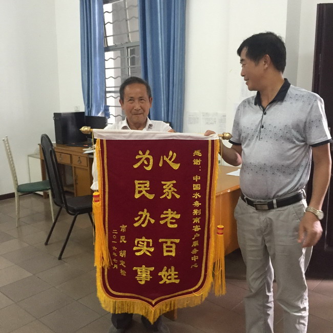 28日該用戶反映表后管道更換后用水問題沒有得到明顯好轉(zhuǎn)。“七一”前夕,集團公司管網(wǎng)管理中心根據(jù)葛總的安排,冒雨對該用戶表前管道進行了更新改造,供水恢復(fù)正常,兩位老人深表感謝!7月5日下午,該用戶為集團公司送來一面“心系老百姓,為民辦實事”的錦旗。