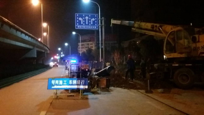 太岳路原有部分供水管網(wǎng)為水泥材質(zhì),經(jīng)過幾十年的運行,已無法滿足水質(zhì)水量的要求,且隨著城市交通量的增大,長期被車輛碾壓時有爆管漏水現(xiàn)象發(fā)生,鑒于此,水務(wù)集團將其作為今年重點實施的管改項目之一,預(yù)計工期75天。太岳路道路沿長江引橋修建,施工環(huán)境相當不利,一是道路狹窄,大型施工車輛白天禁止通行,施工設(shè)備與材料運輸受阻;二是該路段車流人流量非常大,對施工作業(yè)安全性要求很高。為了確保工程按計劃順利開展,同時也不影響道路交通和路邊的商鋪經(jīng)營,水務(wù)集團的施工作業(yè)全部安排在夜晚進行。施工人員每天晚上8:00在作業(yè)區(qū)域搭建好整齊的藍色圍擋,做好各種安全防護,運輸車輛拖運設(shè)備與材料,施工人員夜間抓緊作業(yè),第二天早上6:00做好現(xiàn)場清潔并拆除圍檔,不影響城市環(huán)境衛(wèi)生。時值冬季,夜晚室外氣溫逼近0度,雖然如此,水務(wù)集團的施工人員克服困難抓緊施工,他們采取分段作業(yè),確保施工安全與質(zhì)量,全力推進工程進度。他們飽含著對供水事業(yè)的熱愛,用無畏的精神和辛勤的汗水搭建起城市供水的動脈,保障城市供水的穩(wěn)鍵運行.