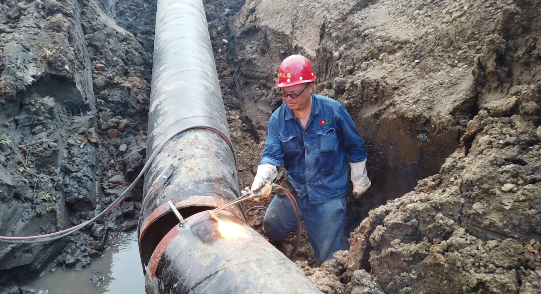 喻林是這次管道焊接的電焊工班長(zhǎng),當(dāng)管道被吊起時(shí),他必須和同事反復(fù)調(diào)整管道位置,以確保管道焊接時(shí)精準(zhǔn)無(wú)誤。高溫酷暑下,豆大的汗珠從他的額頭和臉上不斷涌出,順著黝黑的臉頰滴落在球墨鑄鐵管上,瞬間蒸發(fā)的無(wú)影無(wú)蹤。可他顧不上擦汗,一雙眼睛始終緊盯著焊接點(diǎn)。作為焊工,喻林和同事們必須身著長(zhǎng)袖長(zhǎng)褲,炎炎夏日里,燒焊時(shí)飛濺的火星不僅會(huì)燙傷衣服還會(huì)傷及皮膚。此刻,高溫、火光、噪音就是對(duì)他們的三重“烤驗(yàn)”。