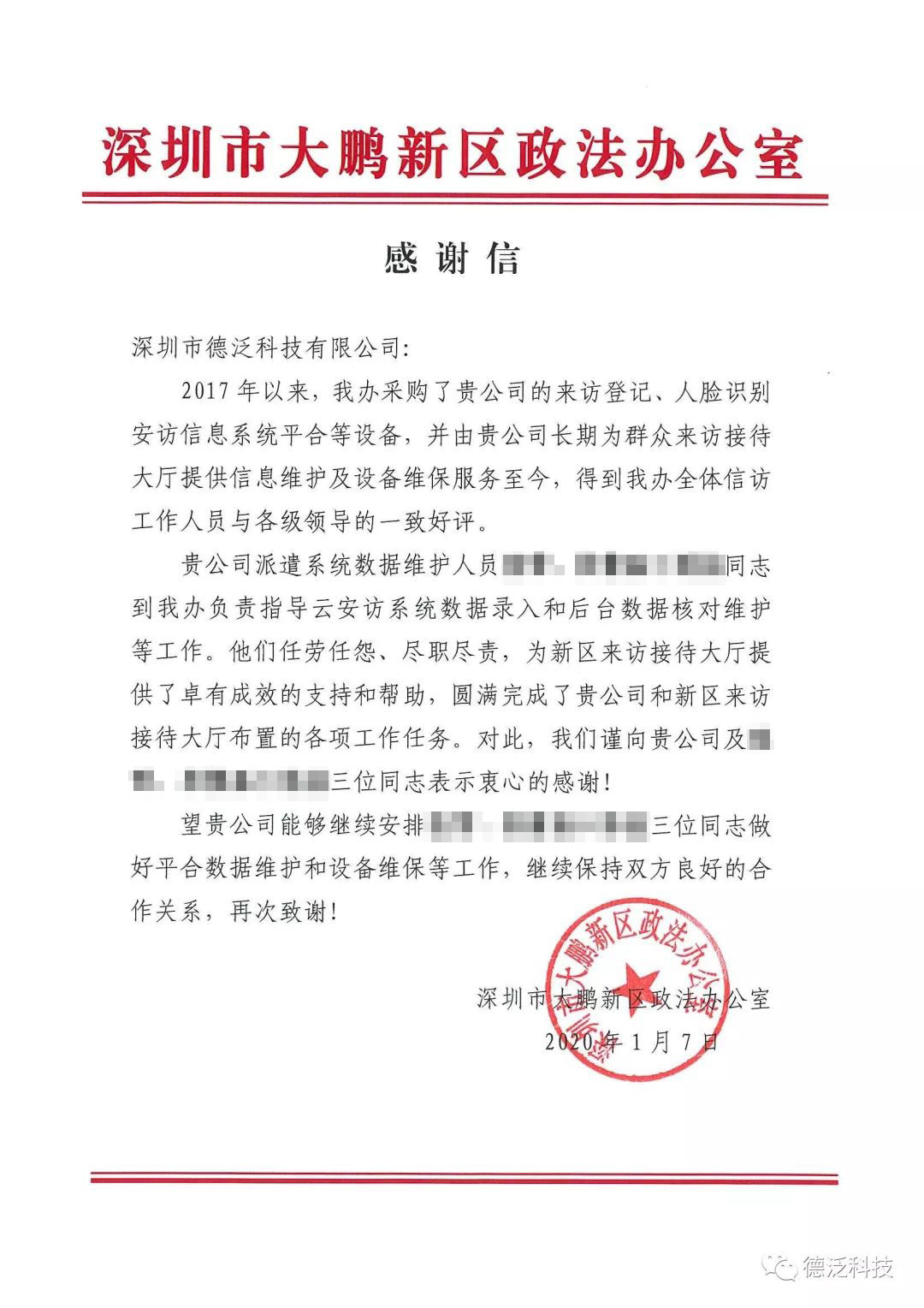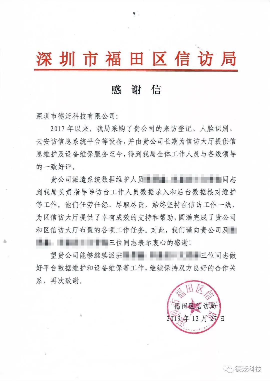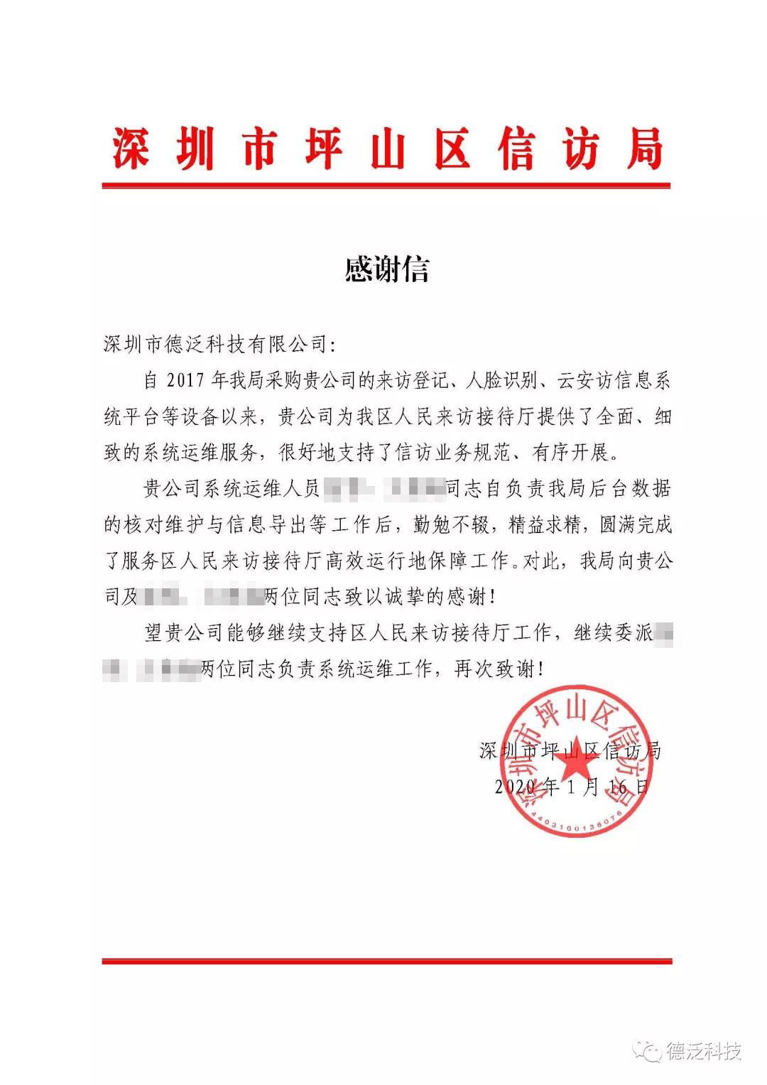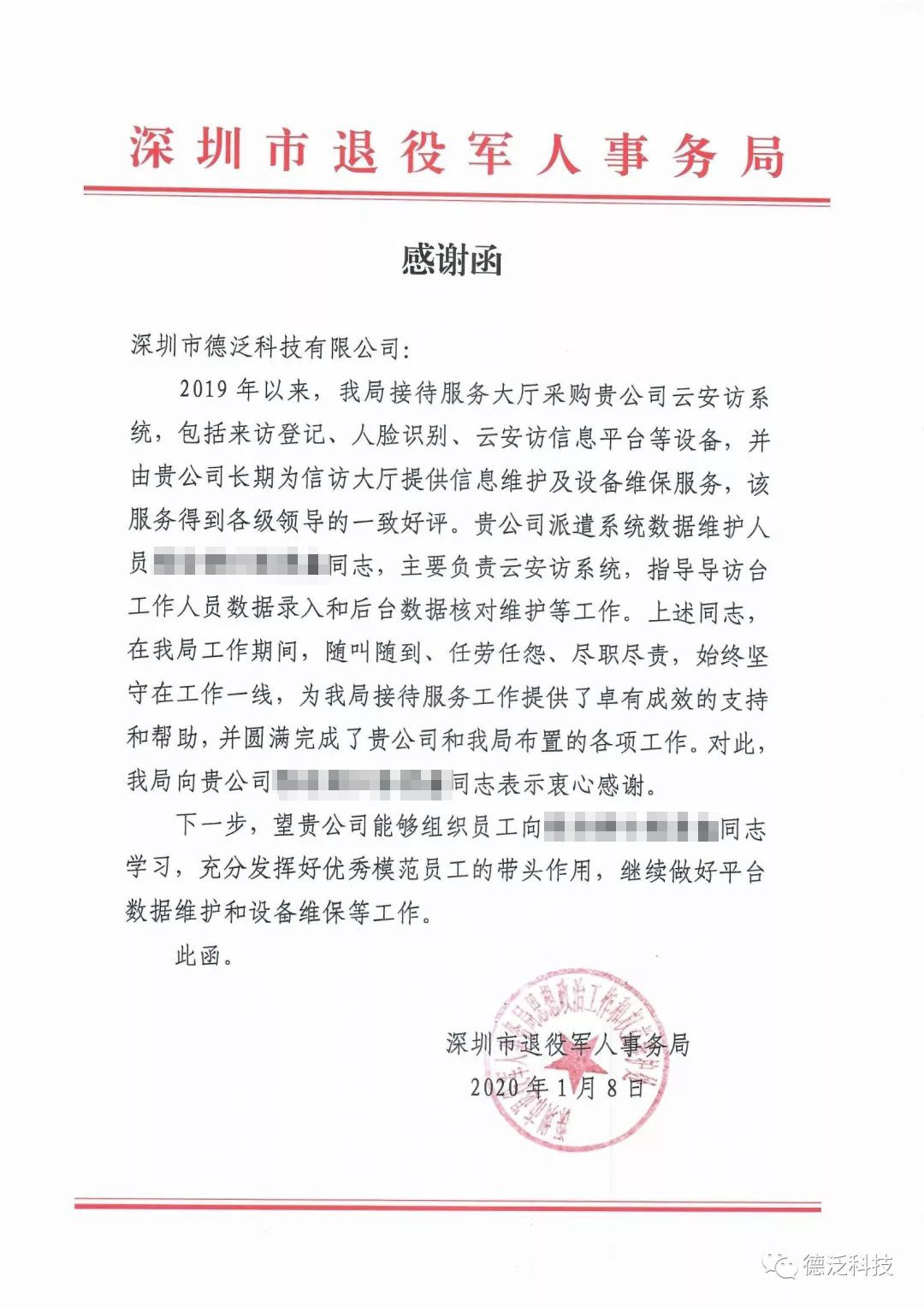 近期,德泛科技陸續(xù)收到了來自深圳市信訪局、深圳市退役軍人事務(wù)局等職能部門的表揚信(感謝函)。深圳市信訪局的表揚信講到:“德泛科技在云安訪信息平臺項目中出色的完成了領(lǐng)導(dǎo)交辦的各項任務(wù),得到了領(lǐng)導(dǎo)的充分肯定與來訪群眾的一致好評?!?/p>